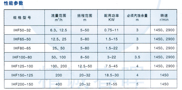 额定性能和安装尺寸符合IS02858标准,制造技术条件符合IS05199标准,与IHF (C)型泵相比泵体为全塑结构前后用金属夹板夹持以支撑和承重,耐磨性强;缩短了叶轮的悬臂,加粗了轴的直径,运行更稳、密封寿命长;悬架体采用三只进口轴承。
